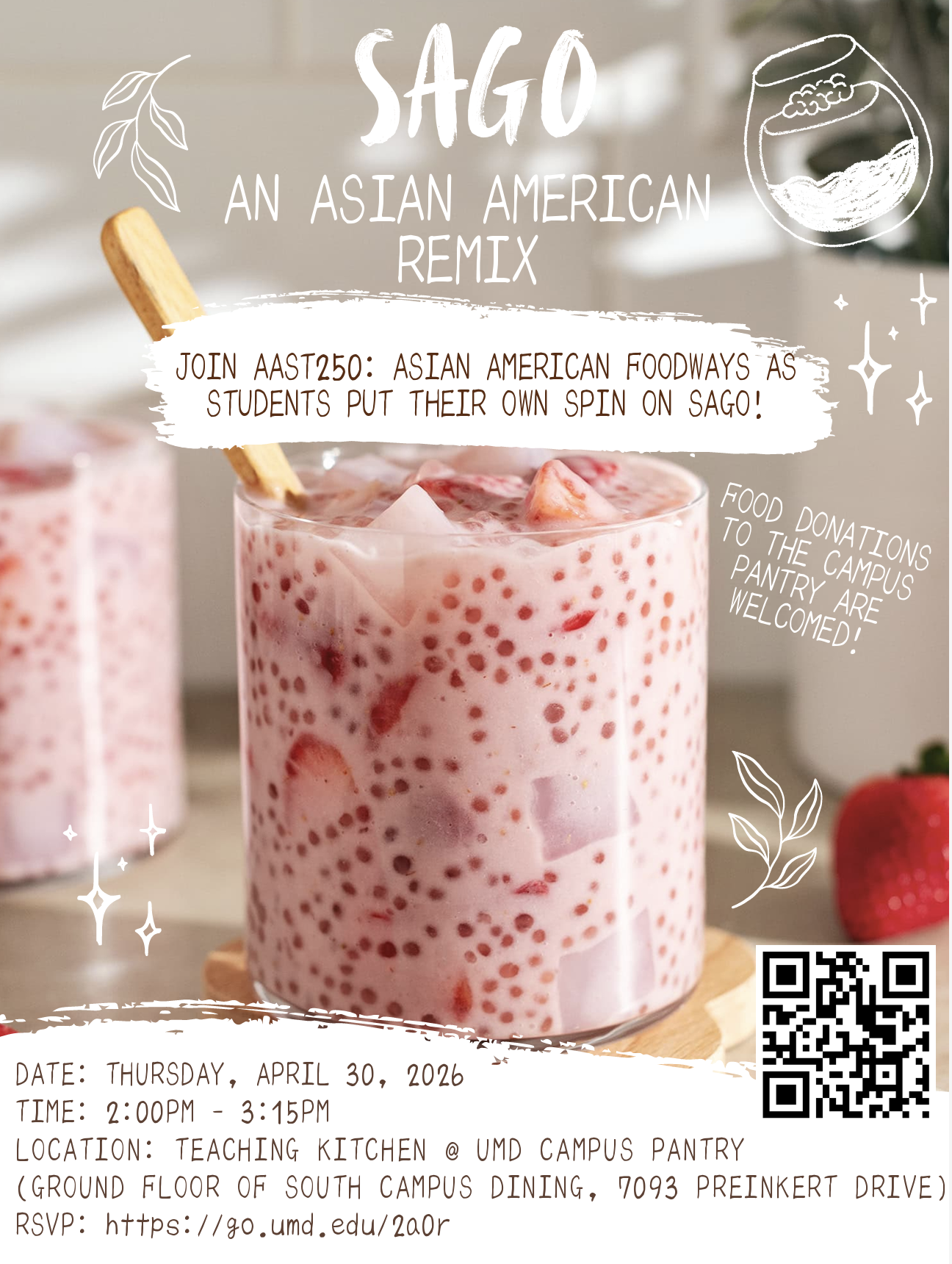 Students from AAST250: Asian American Foodways will be leading an interactive cooking demo featuring sago. While bite-sized, these tiny pearls derived from the tropical palm tree transmit extraordinary stories of Asian American culinary adaptation and resilience. Food donations to the Campus Pantry are welcome.